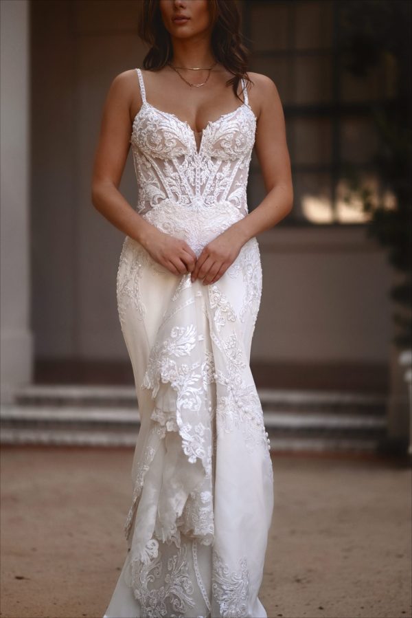 Lovely, ladylike and luxurious. Style 1406 from Martina Liana is a sexy take on a modern bridal silhouette. A plunging V-neckline, beaded spaghetti straps and a sheer bodice with exposed boning and lace details elongate the figure and offer an impeccable fit. The off-the-shoulder puff sleeves with beaded cuffs add a touch of fashion-forward appeal. The sequins on the back of the dress add a soft sparkle, while the delicate buttons, crepe skirt and scalloped lace train add a hint of vintage romance to this glamorous couture wedding gown
