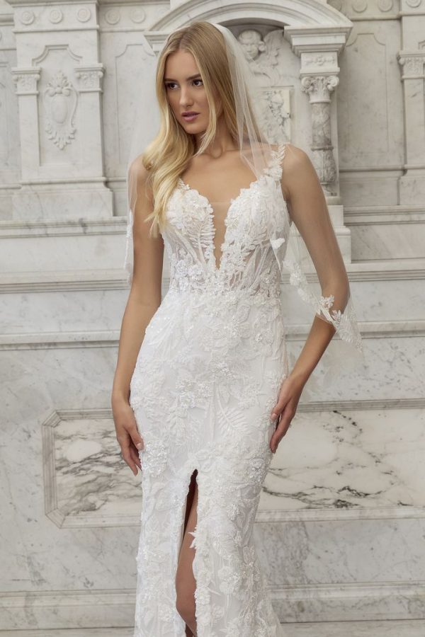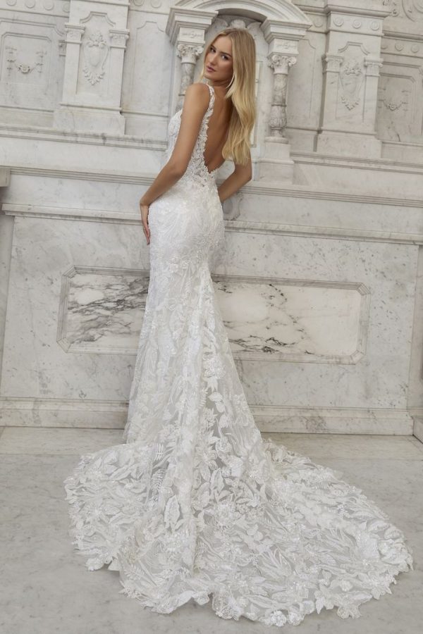 A vision in ivory stretch chiffon and tulle, style 2599-1 Adriel is a dress featuring a decorated, illusion V-cut neckline with dimensional sequined lace appliqués throughout. This fit-and-flare silhouette offers stunning shape around the bride’s face with shimmering lace tank straps and a 20-point boned bodice creating a snatched waistline. Mirroring the plunge in the top of the gown, a thigh-high center skirt slit invites temptation. One of the most notable features of this gown is the alluring low-cut back and 74-inch dramatic train with organic lace trim.