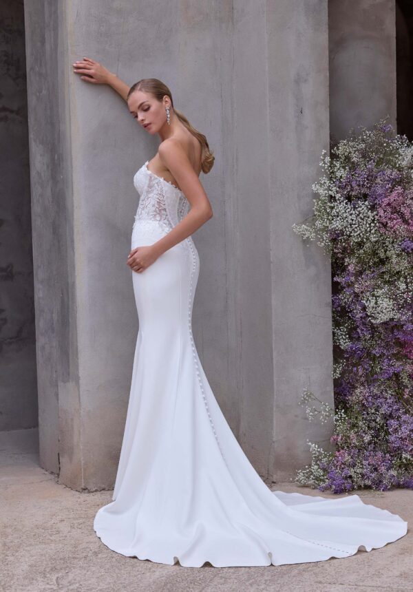 Fit and flare crepe wedding dress has a strapless cat eye neckline on an illusion cut out, basque waist bodice with floral appliqués and corset boning.