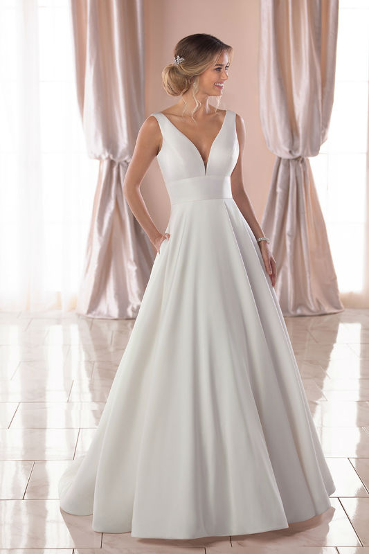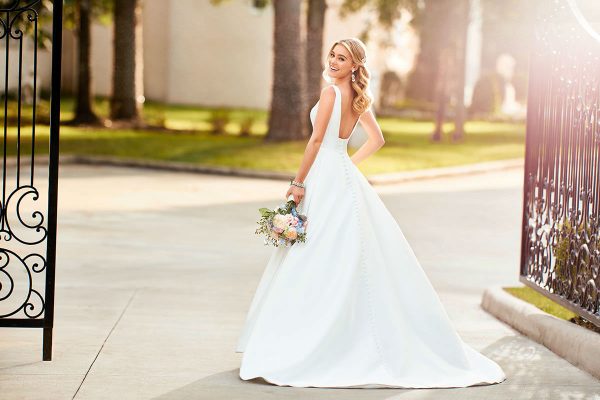 Simply beautiful, this royal-inspired wedding dress is as timeless as love itself. From bridal designer Stella York, this gorgeous gown is for the bride who wants to have a timeless style on her wedding day. Made of matte Mikado fabric, the ballgown silhouette features a modern empire waist and open, square back. A small pleat in the skirt allows the ballgown skirt to keep its shape beautifully. Fabric covered buttons run down the length of the train and pockets have been added for one final modern touch. This royal wedding dress is also available in plus sizes.