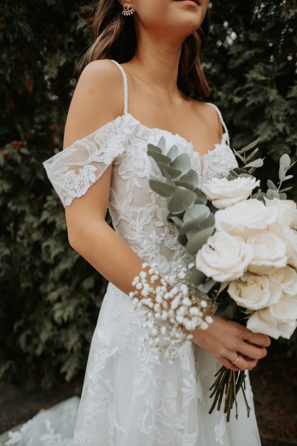 For the bride who adores timeless style with a twist, Style 7447 is the ultimate princess-inspired wedding dress. An elegant soft A-line silhouette and subtle notched scoop neckline add a modern and sophisticated appeal to this fairytale gown. This enchanting design features beautifully beaded spaghetti straps with an option for detachable off-the-shoulder sleeves in a soft romantic lace. With a blend of floral and leaf motifs, sequined hand-placed lace appliques adorn the semi-sheer bodice and organically blend with the frothy tulle layers of the skirt, creating a graceful and elegant effect down the aisle. This wedding dress is also available in plus sizes.