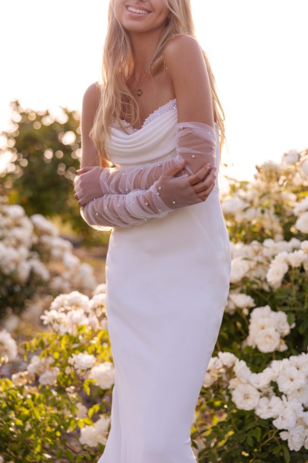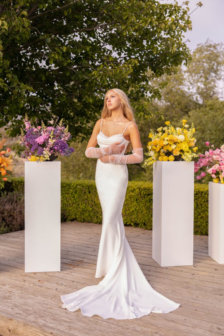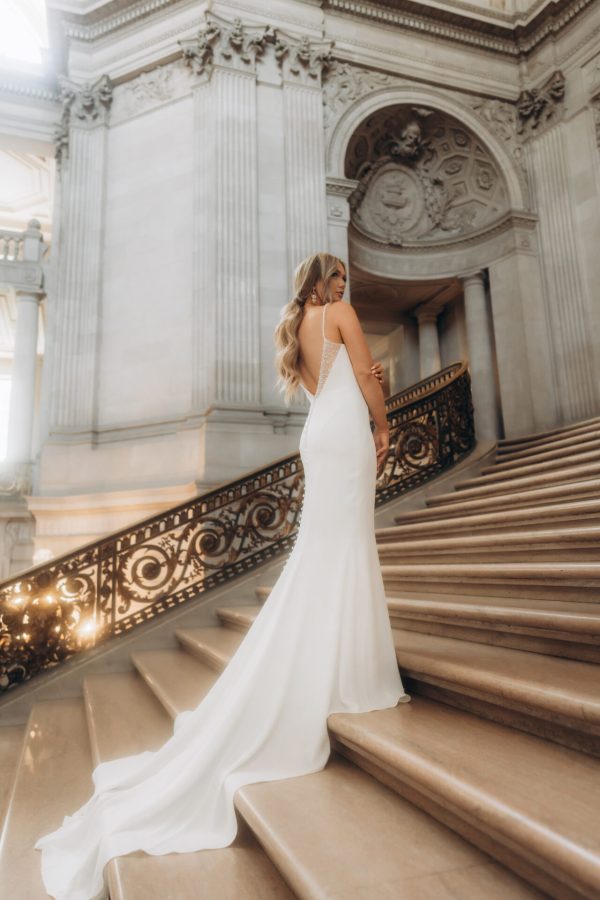 Elegant and sleek, this sexy column wedding dress brings effortless runway fashion to the bridal aisle. Style 7831 features thin, beaded spaghetti straps that meet a flattering draped sweetheart, embellished neckline. Luxe shell crepe fabric gently glides over the figure, melting into an opulent column silhouette with a stunning low back detail to capture every eye on that walk down the aisle. This designer wedding gown was made for the contemporary bride with an affinity for high fashion.