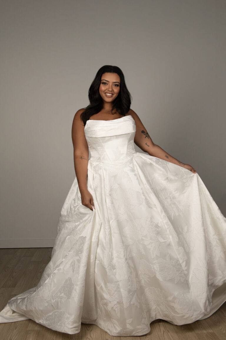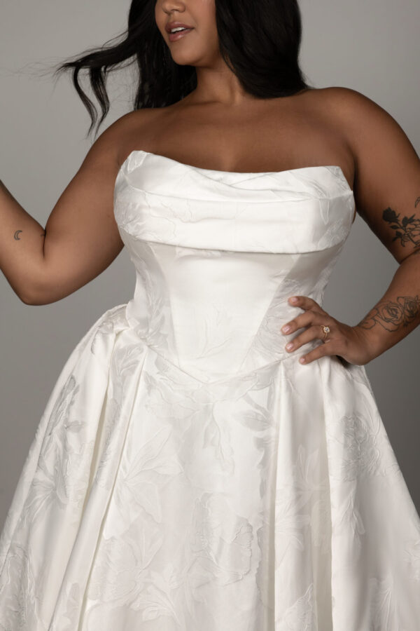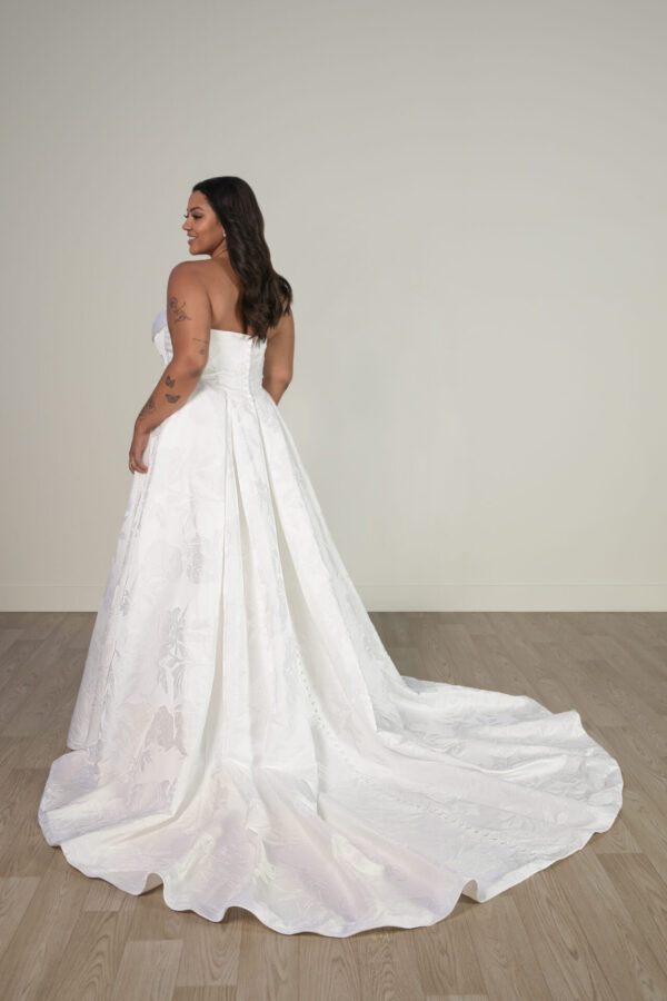 For the bride who combines modern sophistication with timeless romance, Style SY8084 brings together whimsical fairytale charm and contemporary elegance. This breathtaking strapless ballgown features a ruched neckline that gracefully wraps into a basque waist bodice. Contoured seams shape the figure before glowing into a pleated skirt, finished with a row of fabric-covered buttons that add a classic, refined touch. The pleated waist accentuates the princess silhouette, expanding into a voluminous ballgown skirt crafted from luxurious satin, achieving a sleek fashion-forward look.
