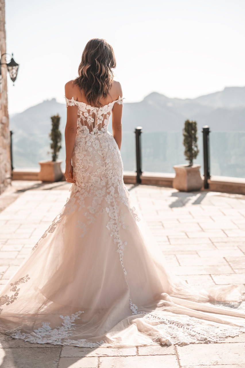 The soft sheen of pearl beading pairs beautifully with the floral lace and sparkling tulle of this romantic, off-shoulder gown.
