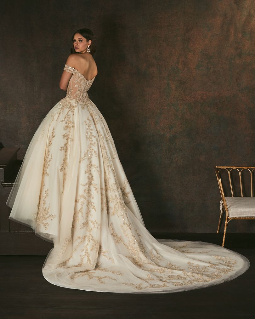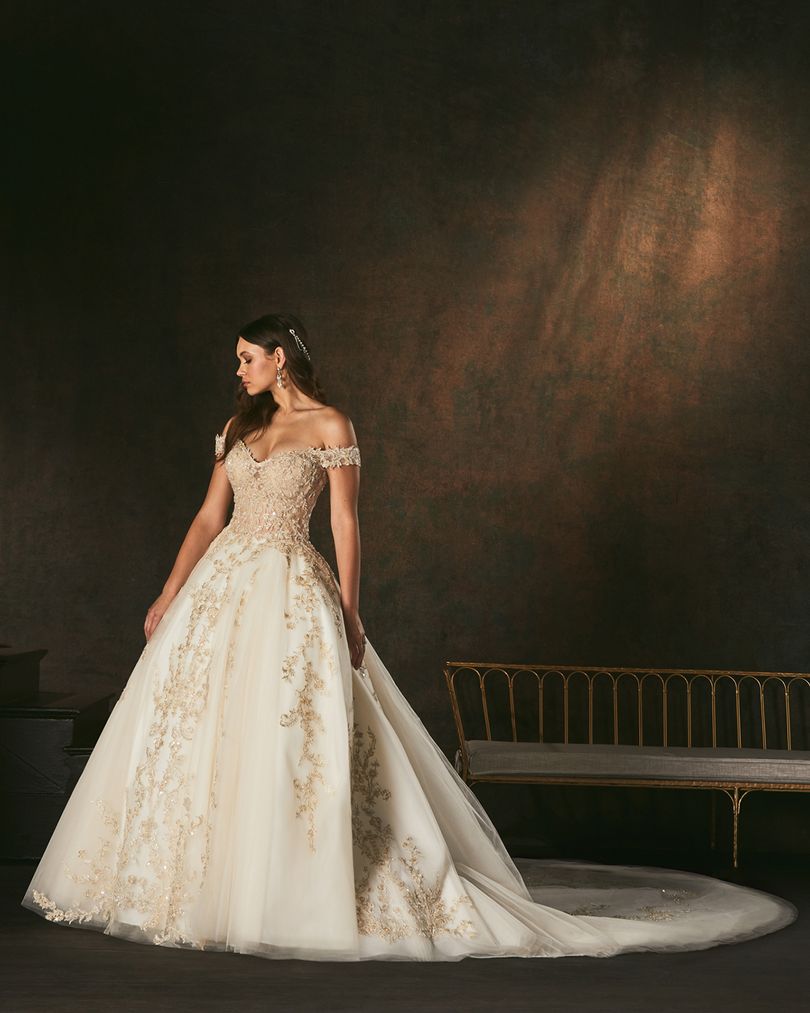 Style C160 Elsa by Amare Couture is the belle of the ball. This jaw-dropping ballgown wedding dress showcases glittering beading and embroidery all along the un-lined bodice, twisting around in a beautiful vine-like pattern that trails lusciously down the voluminous tulle skirt. Off-shoulder sleeves and a sweetheart neckline are sensual and timeless, showing off just the right amount of skin, while a dramatic 100” train makes an unforgettable impact.