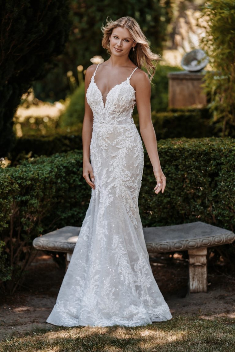Boughs and branches stitched in lace and delicate threading adorn the overlay of this sheath gown.