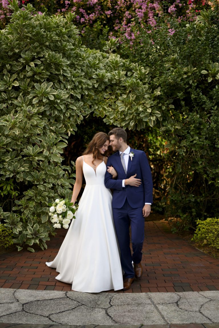 This simple and utterly chic ballgown from Essense of Australia is the statement of every modern bride’s dreams! A seemingly simple design, there’s more to it than meets the eye when you make your grand entrance. The curv,hyuytyyyhjjed V-neckline and shoestring straps are enough to make any minimalist fall in love, not to mention the hidden skirt pockets to send you completely head over heels. The back detail is the real piece of resistance, as the classic V-back is framed by sheer illusion paneling with exposed boning—making this dress truly fashion-forward and one of its kind.