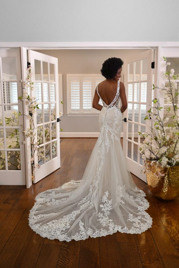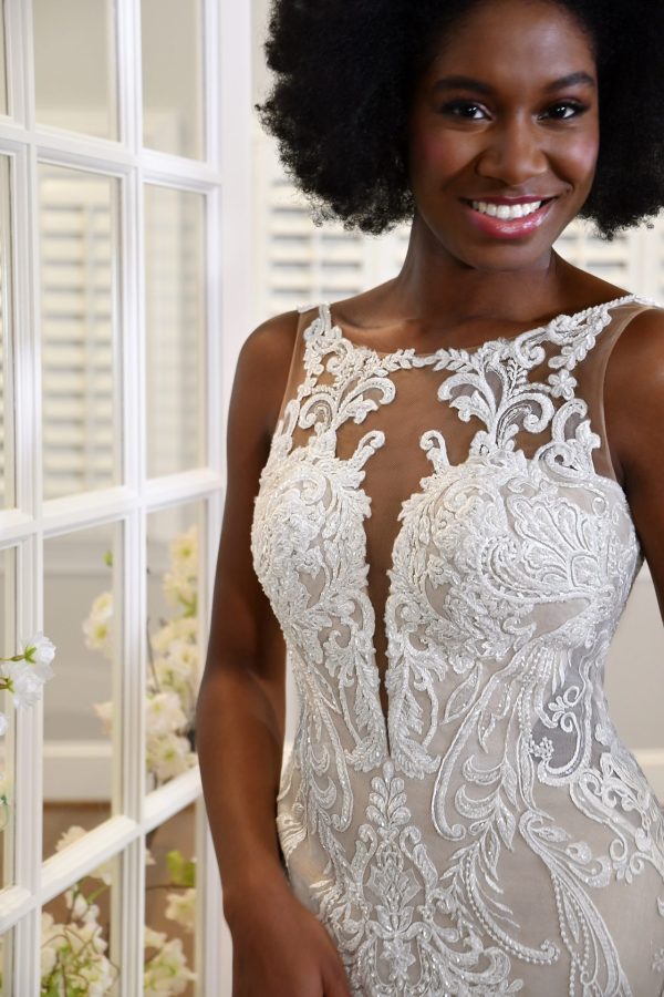 Tradition meets modernity in Style D3153. This quintessential Essense of Australia gown takes classic bridal elements, from lovely lace to a full-length train, and elevates it for the modern bride. Stunning graphic lace placed over the entire bridal gown effortlessly contours the body to highlight and flatter the figure. Negative space is thoughtfully used to accentuate the gorgeous intricacy of the lace pattern for a dramatic effect. The cascading train finishes this dress to give you the ultimate bridal moment while walking down the aisle.