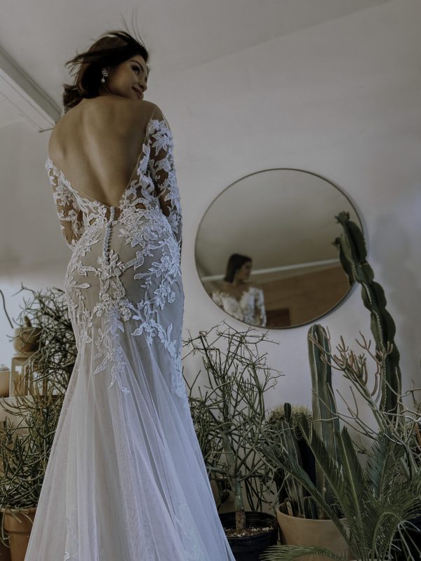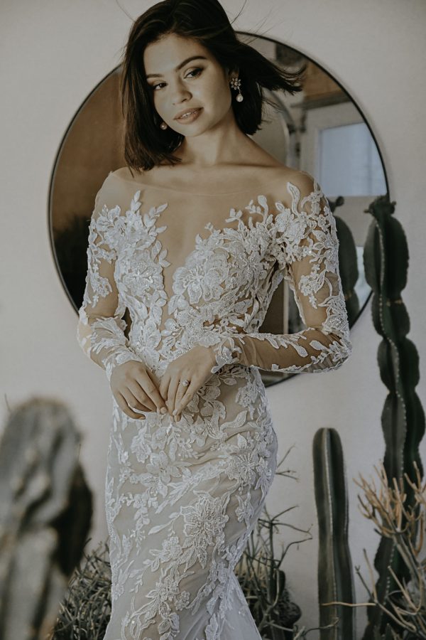 Style D3284 from Essense of Australia is a blend of floral bridal design and ultra-modern fashion. A sheer bodice starts the look off with a bold statement, creating a semi-off-the-shoulder illusion with nude tulle and floating tattoo laces–thoughtfully dispersed throughout the bust and waist for tasteful and flattering coverage. These floating laces continue the tattoo-like effect over the long sleeves, with an organic finish on the cuff for a hint of classic nostalgia. A slight shimmer throughout the fit-and-flare design echoes modern luxury and just a touch of drama, without overwhelming the look. The wide open back is also edged with floating lace details for a fresh, fierce look. Finally, the extra-long scalloped train perfects your bridal moment with incredible organic lace finishing.