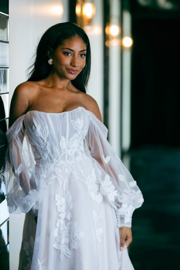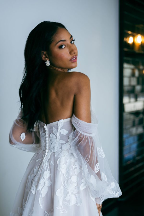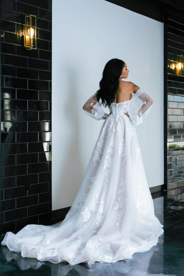 Bringing modern elegance to life, Style D4029 radiates pure bridal bliss in this allover lace A-line wedding gown. Sheer detachable off-the-shoulder blouson sleeves attach to a strapless bodice featuring a flattering scoop neckline. An oversized embroidered lace embellishes the graceful A-line silhouette throughout, resolving at the lace-accented sweeping train. Offering versatility and style, this romantic wedding gown comes in lined and unlined options for varied levels of sheerness, and the detachable sleeves offer a versatile wedding day look. A breathtaking vision down the aisle, this elegant lace gown was made for a lifetime of romantic daydreams. This gown is available in plus sizes.