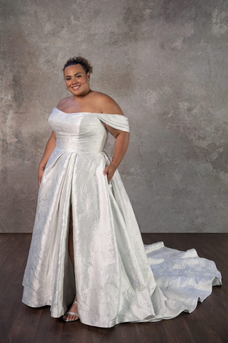 LUXE OFF-THE-SHOULDER PLUS SIZE SATIN A-LINE WEDDING DRESS WITH POCKETS