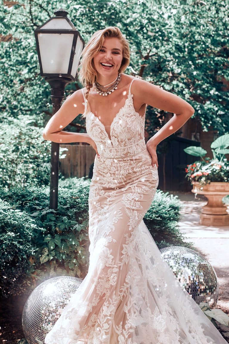 Double banded crystal beading along the waist emphasizes Luisa’s lacy sheath silhouette.