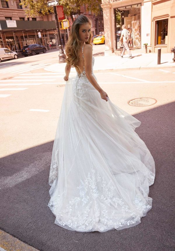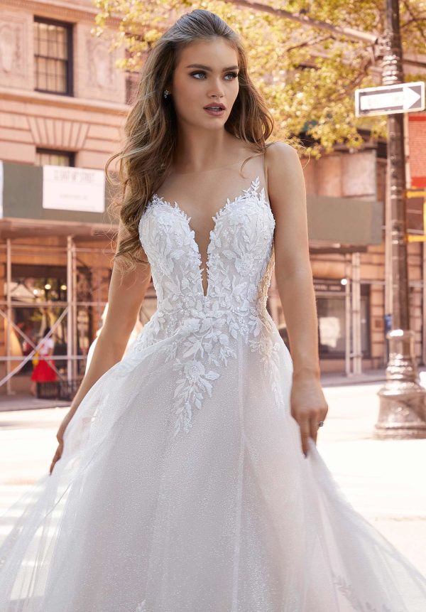 Ethereal A-line has a plunging illusion bodice and open back with crystal beaded floral lace over dimensional glitter tulle.