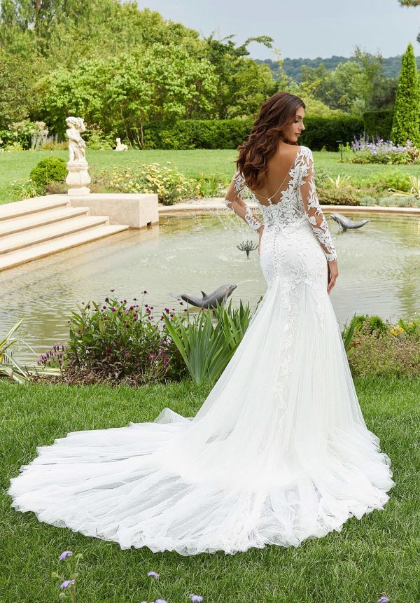 Gorgeous mermaid has bold Venice lace appliqués cascading down the long sleeve bodice with a sheer back and textured godet skirt.