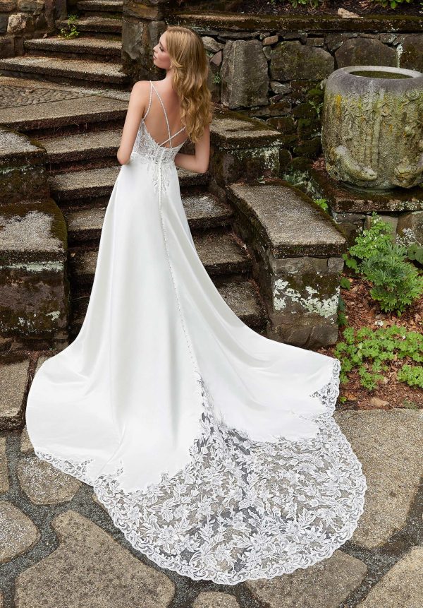 Elegant A-line has a boned bodice with hand-embroidered floral lace and crystal beaded straps on a sleek satin skirt with pockets and a cut-away lace train.