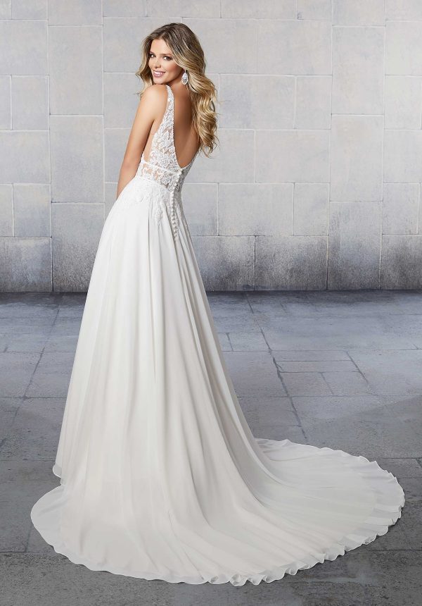 Effortless A-line has a plunging bodice with frosted embroidery and crystal and pearl beaded trim on a breezy chiffon skirt.