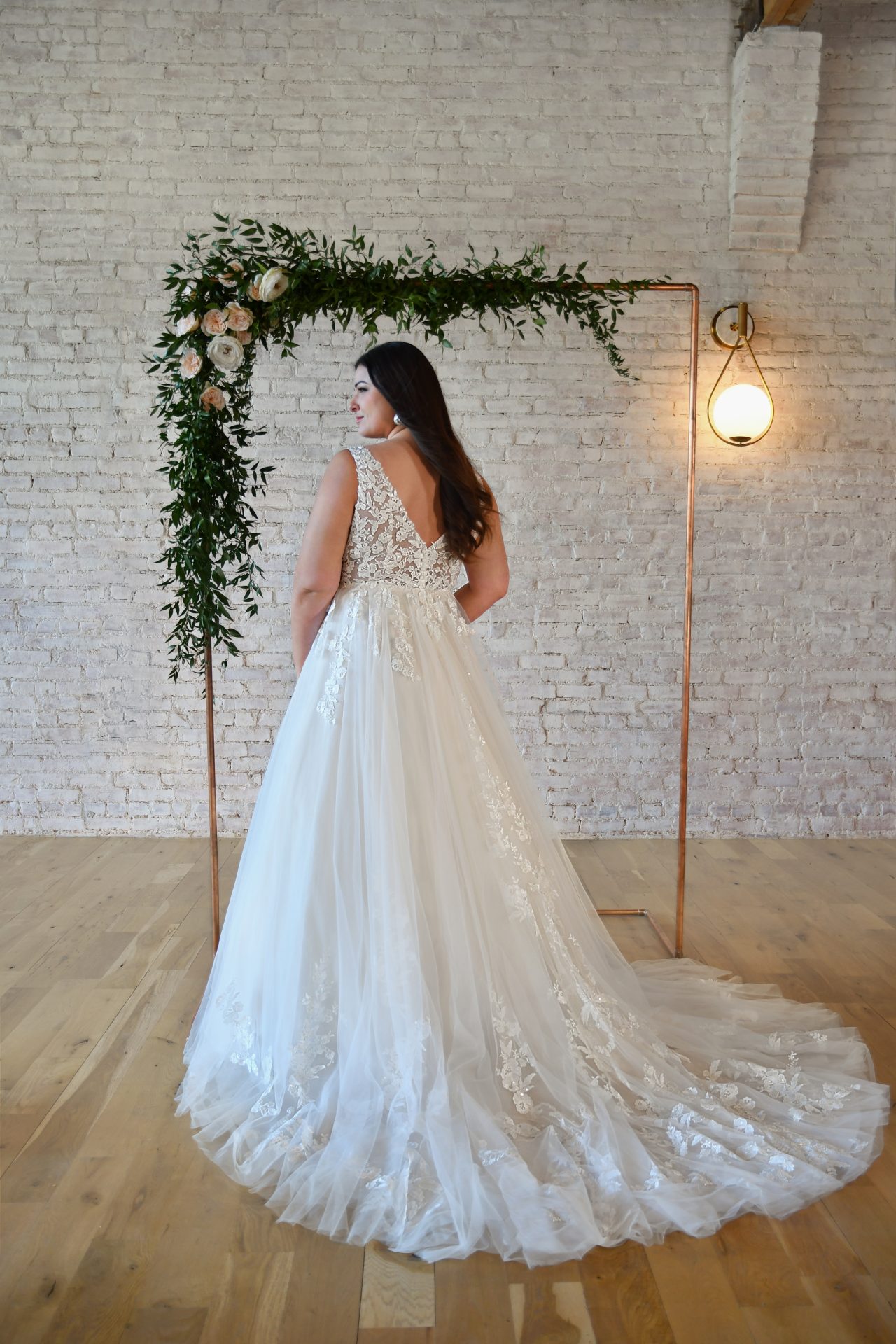 Style 7194 is made for the modern bride with a flirty side. This plus-size wedding dress pairs a timeless ballgown silhouette with swirling lace patterns for a classic bridal look with a twist. The plunging V-neckline features gorgeous lace for a classic but textured effect, with expert design and subtle illusion tulle providing secure comfort and structure for the plus-size bride. Sheer details in the bodice add a sexy touch and show off the stunning intricacies in the lace. The frothy skirt is so soft and sparkly, with layers of tulle and sequin-detailed lace creating a flowing skirt ready to walk down the aisle.