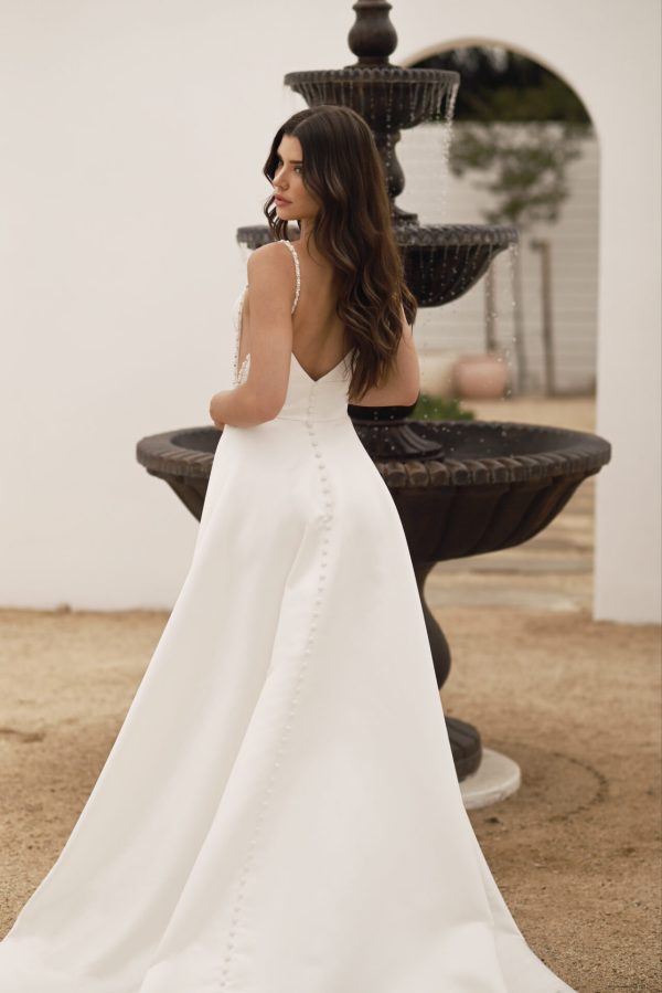 Sleek grand satin exudes the luxurious feel and design of this contemporary A-line wedding dress. From ultra-thin spaghetti straps, Style 7830 features a chic square neckline, fit for the runway and the aisle. Modern side cutouts accentuate the waist to meet an opulent A-line skirt of shining satin. Timeless and fashion-forward all at once, a high leg slit transforms the simple silhouette into a sexy wedding dress fit for the modern bride.