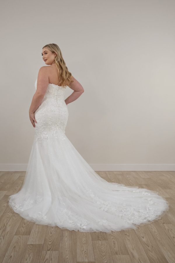 Make a grand entrance in this extravagant sparkle tulle wedding dress with brilliant floral lace embellishments and a stunning fit-and-flare silhouette. Style 7924 features a strapless sweetheart neckline with a modest plunge lined in illusion tulle. Dazzling floral lace appliqués and 3D floral accents embellish this sparkling gown through the hips to meet a sea of voluminous layers in sparkle tulle before cascading into a sweeping lace-accented train. For the glamorous princess bride who believes more is more, this luxurious wedding gown was made for the modern fairytale wedding. This wedding gown’s bodice is available lined and unlined.
