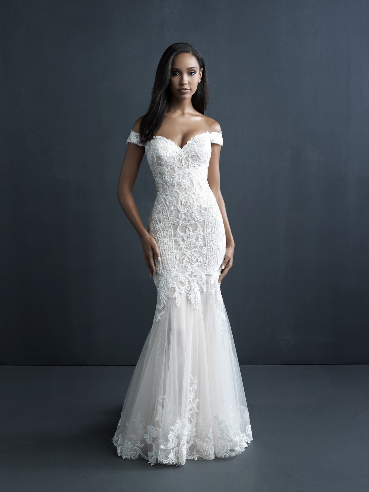 Dazzling detail work captures the eye in this off-shoulder sheath.