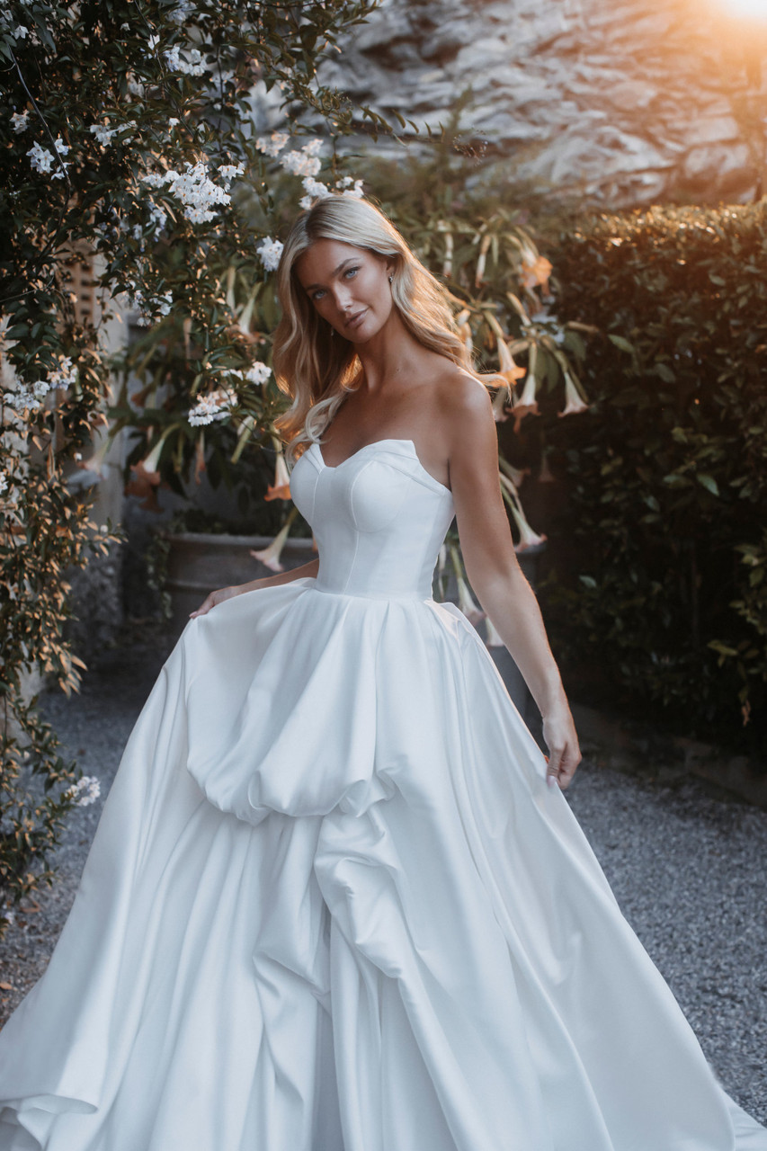Light plays beautifully over Nova’s jaw-dropping Mikado ballgown silhouette, which is chic and minimalist, accented only by a dramatic gathered skirt and optional contrasting lace sleeves.