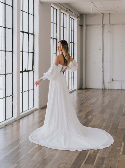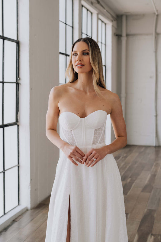 Hayley is designed for unique brides seeking a non-traditional yet undeniably bridal look. With embroidered linear fabric and floral accents, this dress boasts a stunning and unique design. Her exposed boning and bustier bodice add a touch of sexiness, while the detachable off-shoulder sleeves and sheer sides offer sophistication. The side slit and finished hem create a modern and effortlessly flowy look, while the corset closure and invisible zipper ensure easy wear.