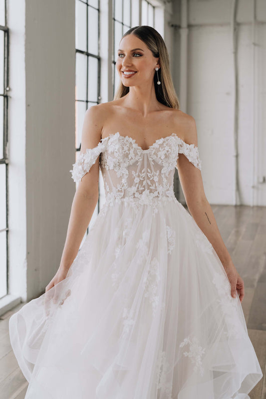 Jessica is a dream come true for youthful brides seeking a fairy tale princess look. Her subtle glitter tulle under layer adds a touch of magic, while the bustier bodice boasts laser-cut 3D floral appliqués with bugle bead and pearl accents. The detachable off-shoulder sleeves provide an elegant touch, and the dress features a sheer bodice with corset closure to ensure an impeccable fit, as well as long feminine skirt layers. This dress guarantees that any bride will look stunning on her special day.