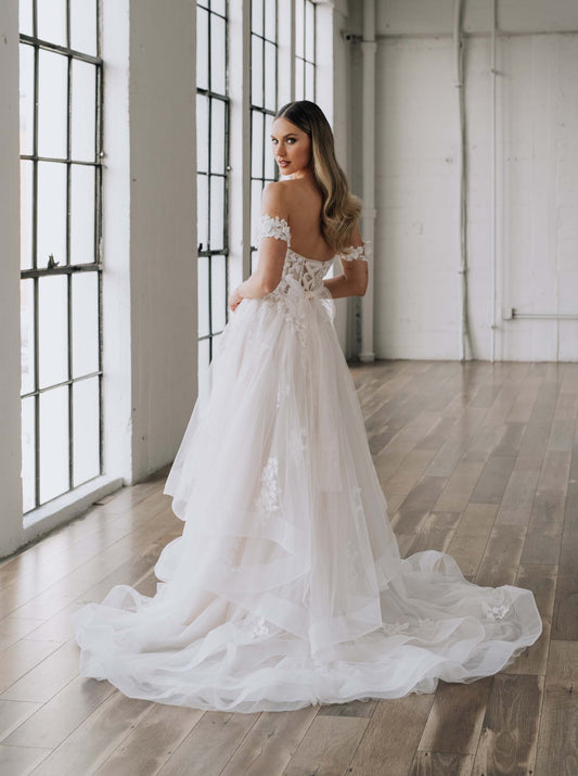 Layered Lace Wedding Dress with Off-Shoulder Sleeves