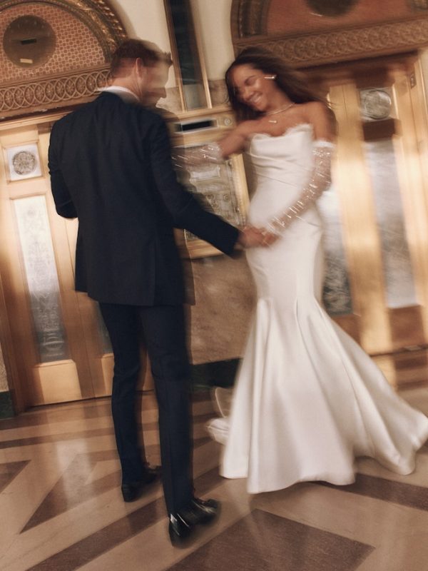 Satin ruched fit-and flare-wedding gown with sequin lace detail and optional sleeves