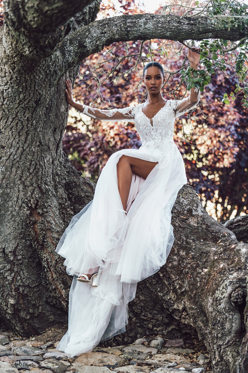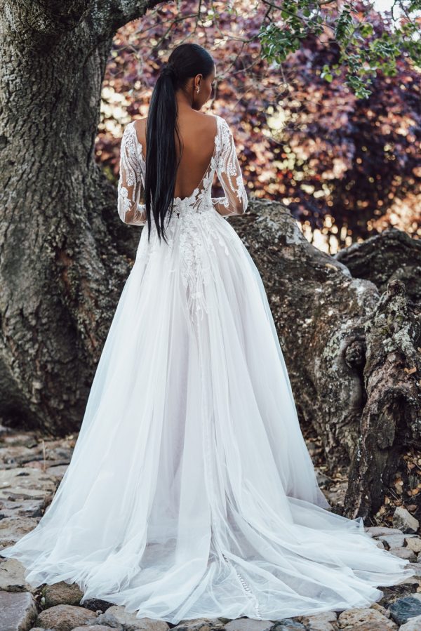 Sparkling sequined appliqués trail down the bodice and illusion sleeves of this dreamy A-line gown